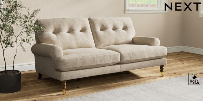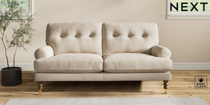 7.2.10 Erin Buttoned Back Deep Relaxed Sit 3 Seater Small Sofa Boucle Weave Easy Clean Dark Natural High Classic Turned Brass Castor - Mid | Made Click here to use our website with more accessibility support, for example screen readers