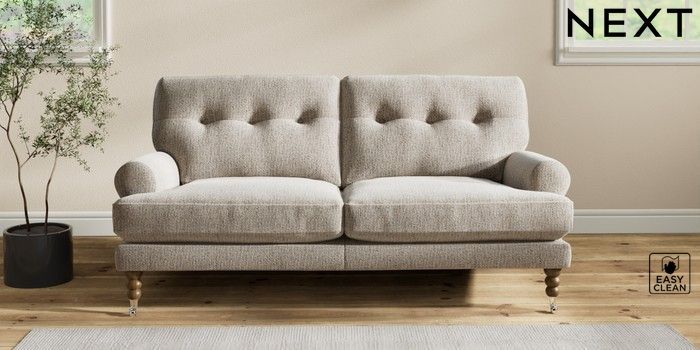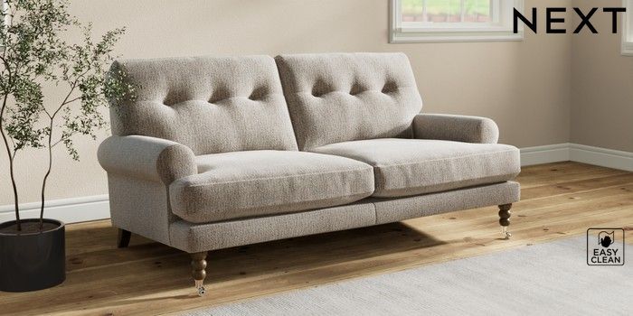 7.2.10 Erin Buttoned Back Deep Relaxed Sit 3 Seater Small Sofa Chunky Boucle Easy Clean Dove High Classic Turned Chrome Castor - Mid | Made Click here to use our website with more accessibility support, for example screen readers