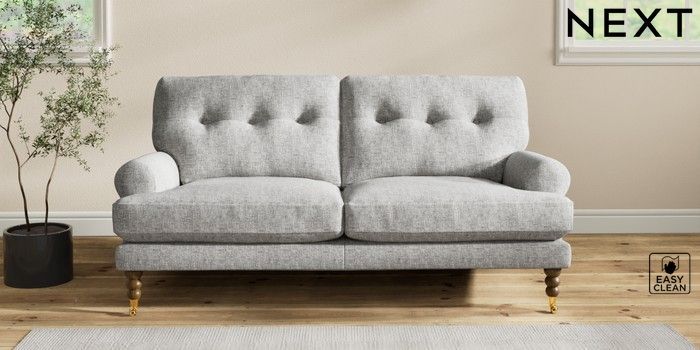 7.2.10 Erin Buttoned Back Deep Relaxed Sit 3 Seater Small Sofa Chunky Boucle Easy Clean Light Grey High Classic Turned Brass Castor - Mid | Made Click here to use our website with more accessibility support, for example screen readers