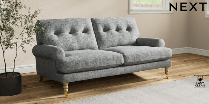 7.2.10 Erin Buttoned Back Deep Relaxed Sit 3 Seater Small Sofa Chunky Boucle Easy Clean Mid Grey High Classic Turned Brass Castor - Light | Made Click here to use our website with more accessibility support, for example screen readers