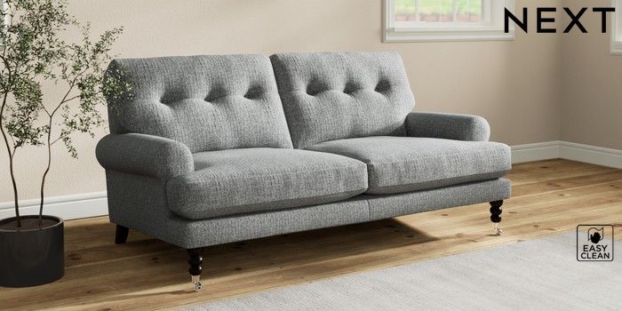 7.2.10 Erin Buttoned Back Deep Relaxed Sit 3 Seater Small Sofa Chunky Boucle Easy Clean Mid Grey High Classic Turned Chrome Castor - Dark | Made Click here to use our website with more accessibility support, for example screen readers