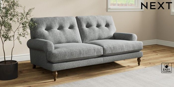 7.2.10 Erin Buttoned Back Deep Relaxed Sit 3 Seater Small Sofa Chunky Boucle Easy Clean Mid Grey High Classic Turned - Mid | Made Click here to use our website with more accessibility support, for example screen readers