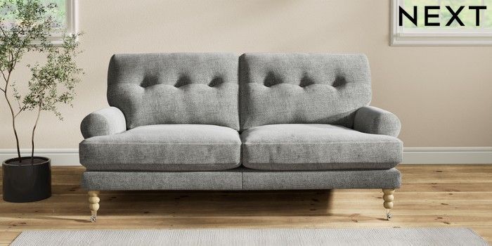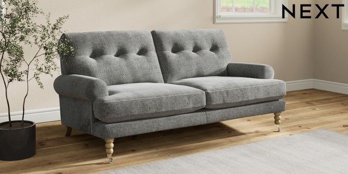 7.2.10 Erin Buttoned Back Deep Relaxed Sit 3 Seater Small Sofa Chunky Chenille Dark Grey High Classic Turned Chrome Castor - Light | Made Click here to use our website with more accessibility support, for example screen readers