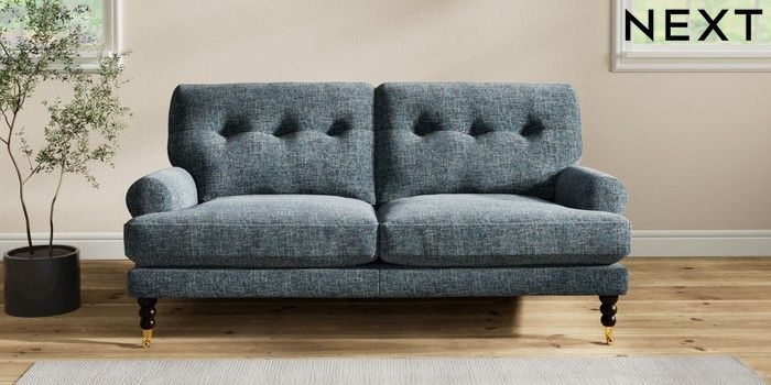 7.2.10 Erin Buttoned Back Deep Relaxed Sit 3 Seater Small Sofa Chunky Chenille Dark Navy Blue High Classic Turned Brass Castor - Dark | Made Click here to use our website with more accessibility support, for example screen readers