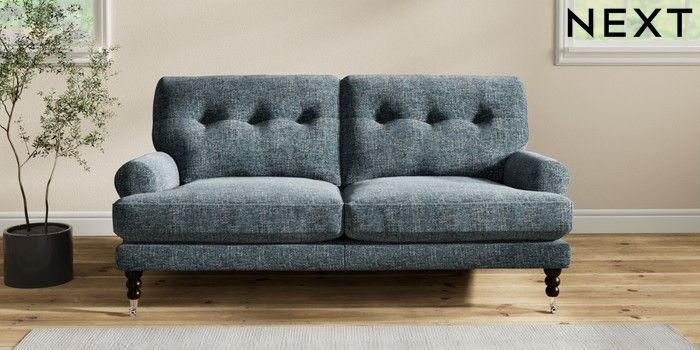 7.2.10 Erin Buttoned Back Deep Relaxed Sit 3 Seater Small Sofa Chunky Chenille Dark Navy Blue High Classic Turned Chrome Castor - Dark | Made Click here to use our website with more accessibility support, for example screen readers