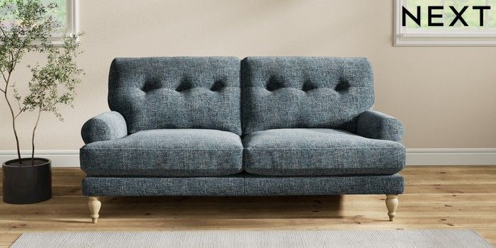 7.2.10 Erin Buttoned Back Deep Relaxed Sit 3 Seater Small Sofa Chunky Chenille Dark Navy Blue High Classic Turned - Light | Made Click here to use our website with more accessibility support, for example screen readers