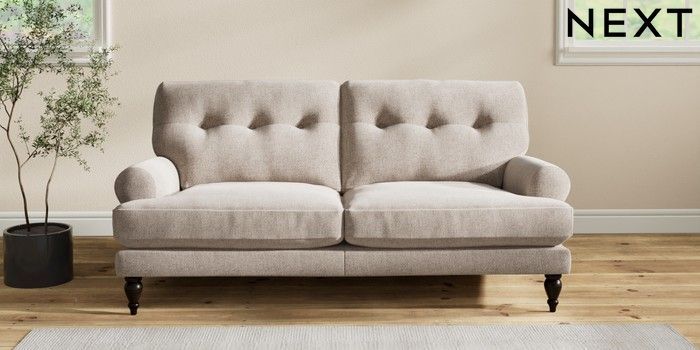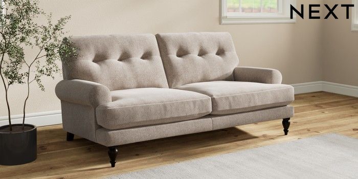 7.2.10 Erin Buttoned Back Deep Relaxed Sit 3 Seater Small Sofa Chunky Chenille Light Dove High Classic Turned - Dark | Made Click here to use our website with more accessibility support, for example screen readers