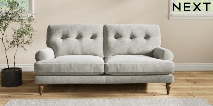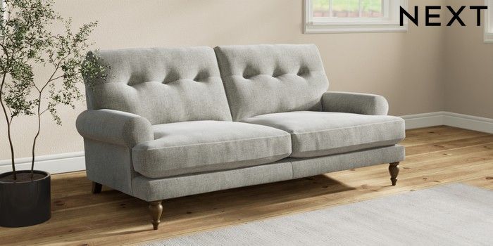 7.2.10 Erin Buttoned Back Deep Relaxed Sit 3 Seater Small Sofa Chunky Chenille Light Grey High Classic Turned - Mid | Made Click here to use our website with more accessibility support, for example screen readers
