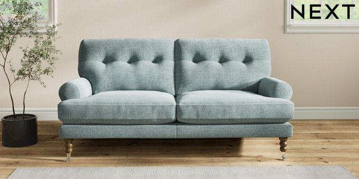 7.2.10 Erin Buttoned Back Deep Relaxed Sit 3 Seater Small Sofa Chunky Chenille Light Teal Green High Classic Turned Chrome Castor - Mid | Made Click here to use our website with more accessibility support, for example screen readers