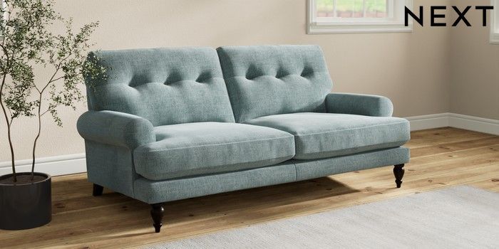 7.2.10 Erin Buttoned Back Deep Relaxed Sit 3 Seater Small Sofa Chunky Chenille Light Teal Green High Classic Turned - Dark | Made Click here to use our website with more accessibility support, for example screen readers