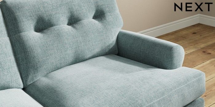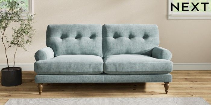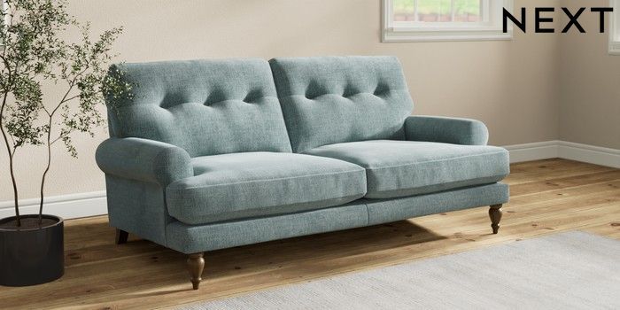 7.2.10 Erin Buttoned Back Deep Relaxed Sit 3 Seater Small Sofa Chunky Chenille Light Teal Green High Classic Turned - Mid | Made Click here to use our website with more accessibility support, for example screen readers