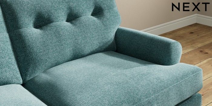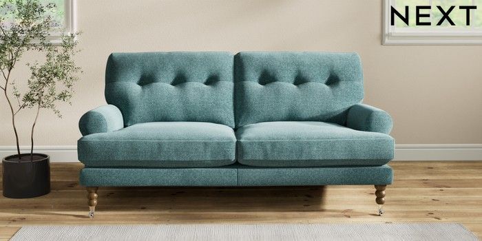7.2.10 Erin Buttoned Back Deep Relaxed Sit 3 Seater Small Sofa Chunky Chenille Mid Teal Green High Classic Turned Chrome Castor - Mid | Made Click here to use our website with more accessibility support, for example screen readers