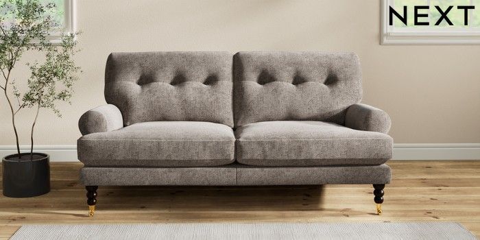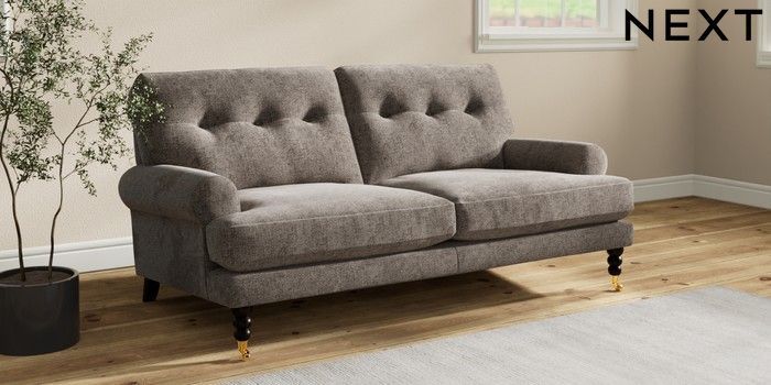 7.2.10 Erin Buttoned Back Deep Relaxed Sit 3 Seater Small Sofa Chunky Chenille Mink Brown High Classic Turned Brass Castor - Dark | Made Click here to use our website with more accessibility support, for example screen readers