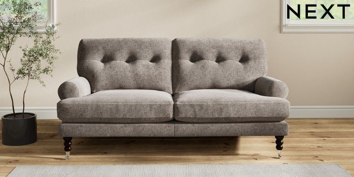 7.2.10 Erin Buttoned Back Deep Relaxed Sit 3 Seater Small Sofa Chunky Chenille Mink Brown High Classic Turned Chrome Castor - Dark | Made Click here to use our website with more accessibility support, for example screen readers