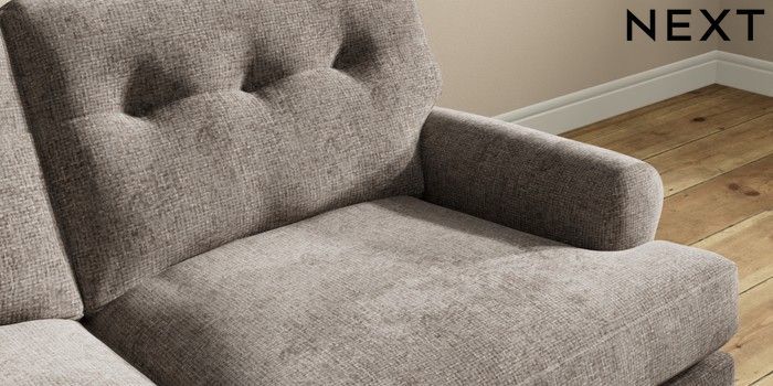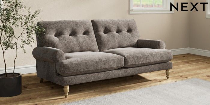 7.2.10 Erin Buttoned Back Deep Relaxed Sit 3 Seater Small Sofa Chunky Chenille Mink Brown High Classic Turned - Light | Made Click here to use our website with more accessibility support, for example screen readers