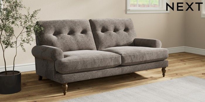 7.2.10 Erin Buttoned Back Deep Relaxed Sit 3 Seater Small Sofa Chunky Chenille Mink Brown High Classic Turned - Mid | Made Click here to use our website with more accessibility support, for example screen readers