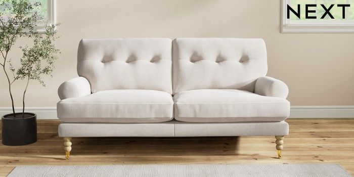 7.2.10 Erin Buttoned Back Deep Relaxed Sit 3 Seater Small Sofa Chunky Chenille Oyster High Classic Turned Brass Castor - Light | Made Click here to use our website with more accessibility support, for example screen readers