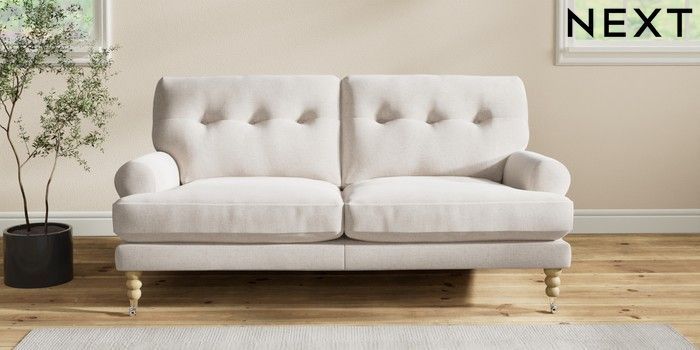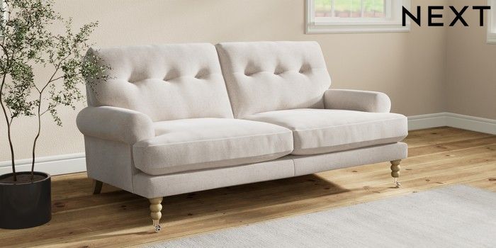 7.2.10 Erin Buttoned Back Deep Relaxed Sit 3 Seater Small Sofa Chunky Chenille Oyster High Classic Turned Chrome Castor - Light | Made Click here to use our website with more accessibility support, for example screen readers