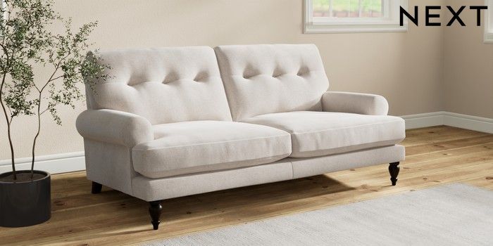 7.2.10 Erin Buttoned Back Deep Relaxed Sit 3 Seater Small Sofa Chunky Chenille Oyster High Classic Turned - Dark | Made Click here to use our website with more accessibility support, for example screen readers