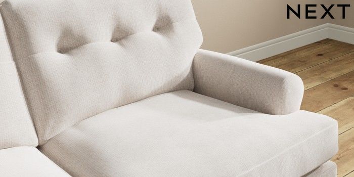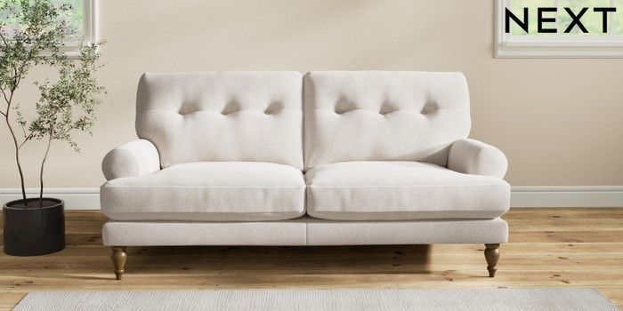 7.2.10 Erin Buttoned Back Deep Relaxed Sit 3 Seater Small Sofa Chunky Chenille Oyster High Classic Turned - Mid | Made Click here to use our website with more accessibility support, for example screen readers