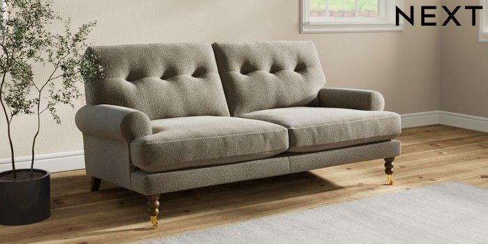 7.2.10 Erin Buttoned Back Deep Relaxed Sit 3 Seater Small Sofa Chunky Marl Light Olive Green High Classic Turned Brass Castor - Mid | Made Click here to use our website with more accessibility support, for example screen readers