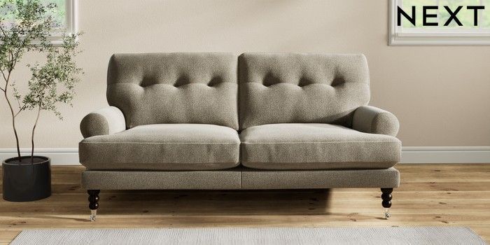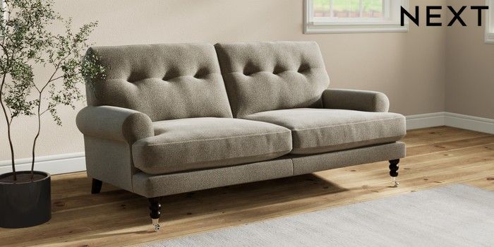 7.2.10 Erin Buttoned Back Deep Relaxed Sit 3 Seater Small Sofa Chunky Marl Light Olive Green High Classic Turned Chrome Castor - Dark | Made Click here to use our website with more accessibility support, for example screen readers