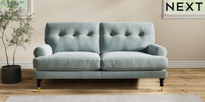 7.2.10 Erin Buttoned Back Deep Relaxed Sit 3 Seater Small Sofa Chunky Marl Mid Blue High Classic Turned Brass Castor - Dark | Made Click here to use our website with more accessibility support, for example screen readers