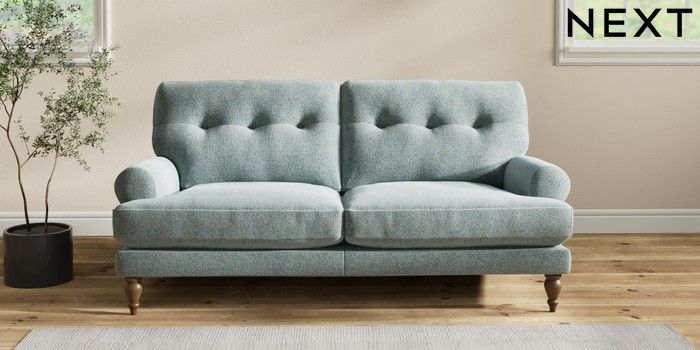 7.2.10 Erin Buttoned Back Deep Relaxed Sit 3 Seater Small Sofa Chunky Marl Mid Blue High Classic Turned - Mid | Made Click here to use our website with more accessibility support, for example screen readers