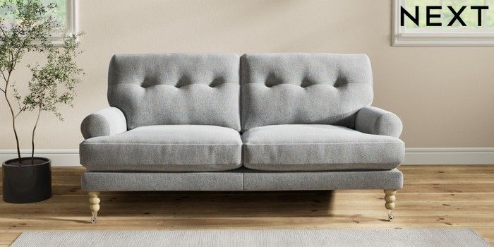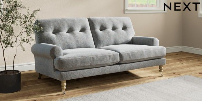 7.2.10 Erin Buttoned Back Deep Relaxed Sit 3 Seater Small Sofa Chunky Marl Mid Grey High Classic Turned Chrome Castor - Light | Made Click here to use our website with more accessibility support, for example screen readers