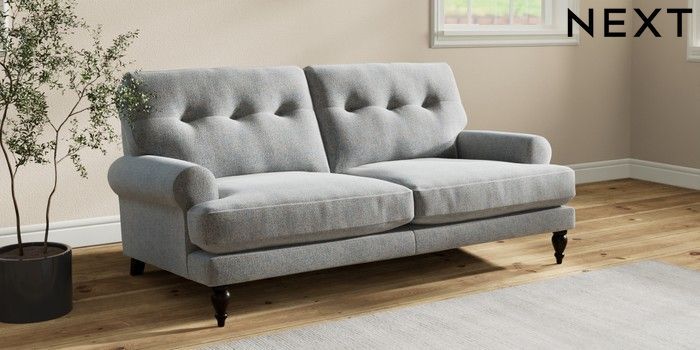 7.2.10 Erin Buttoned Back Deep Relaxed Sit 3 Seater Small Sofa Chunky Marl Mid Grey High Classic Turned - Dark | Made Click here to use our website with more accessibility support, for example screen readers