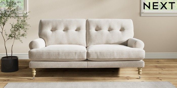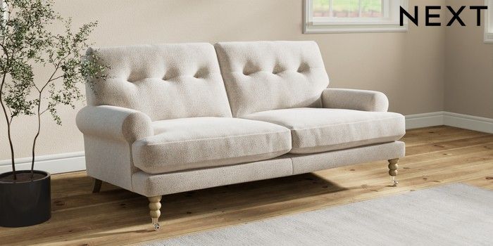 7.2.10 Erin Buttoned Back Deep Relaxed Sit 3 Seater Small Sofa Chunky Marl Oyster High Classic Turned Chrome Castor - Light | Made Click here to use our website with more accessibility support, for example screen readers