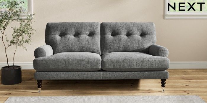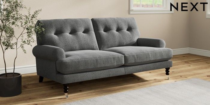 7.2.10 Erin Buttoned Back Deep Relaxed Sit 3 Seater Small Sofa Chunky Texture Dark Grey High Classic Turned Chrome Castor - Dark | Made Click here to use our website with more accessibility support, for example screen readers