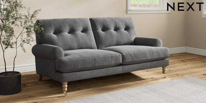 7.2.10 Erin Buttoned Back Deep Relaxed Sit 3 Seater Small Sofa Chunky Texture Dark Grey High Classic Turned Chrome Castor - Light | Made Click here to use our website with more accessibility support, for example screen readers