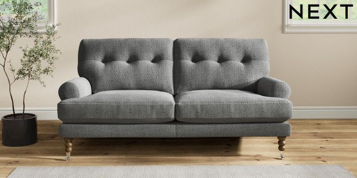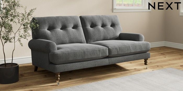7.2.10 Erin Buttoned Back Deep Relaxed Sit 3 Seater Small Sofa Chunky Texture Dark Grey High Classic Turned Chrome Castor - Mid | Made Click here to use our website with more accessibility support, for example screen readers