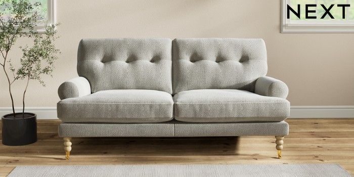 7.2.10 Erin Buttoned Back Deep Relaxed Sit 3 Seater Small Sofa Chunky Texture Dove High Classic Turned Brass Castor - Light | Made Click here to use our website with more accessibility support, for example screen readers