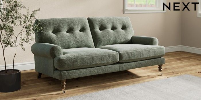 7.2.10 Erin Buttoned Back Deep Relaxed Sit 3 Seater Small Sofa Chunky Texture Mid Forest Green High Classic Turned Chrome Castor - Mid | Made Click here to use our website with more accessibility support, for example screen readers