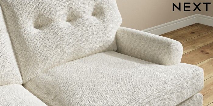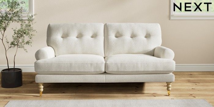 7.2.10 Erin Buttoned Back Deep Relaxed Sit 3 Seater Small Sofa Chunky Texture Oyster High Classic Turned Brass Castor - Light | Made Click here to use our website with more accessibility support, for example screen readers
