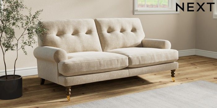 7.2.10 Erin Buttoned Back Deep Relaxed Sit 3 Seater Small Sofa Chunky Weave Cream High Classic Turned Brass Castor - Mid | Made Click here to use our website with more accessibility support, for example screen readers