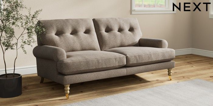 7.2.10 Erin Buttoned Back Deep Relaxed Sit 3 Seater Small Sofa Chunky Weave Dark Natural High Classic Turned Brass Castor - Light | Made Click here to use our website with more accessibility support, for example screen readers