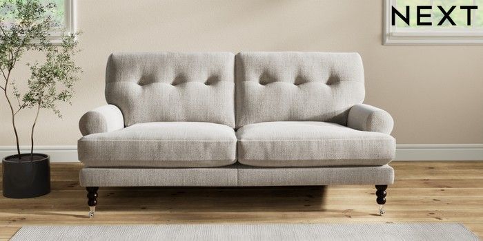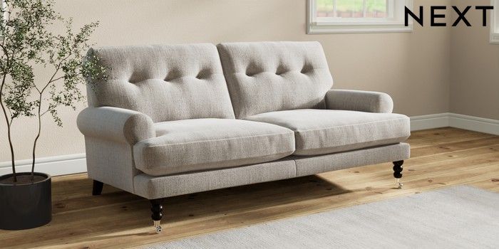 7.2.10 Erin Buttoned Back Deep Relaxed Sit 3 Seater Small Sofa Chunky Weave Dove Grey High Classic Turned Chrome Castor - Dark | Made Click here to use our website with more accessibility support, for example screen readers