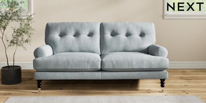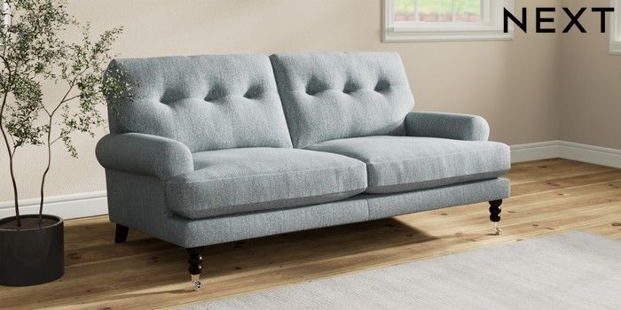 7.2.10 Erin Buttoned Back Deep Relaxed Sit 3 Seater Small Sofa Chunky Weave Mid Blue High Classic Turned Chrome Castor - Dark | Made Click here to use our website with more accessibility support, for example screen readers