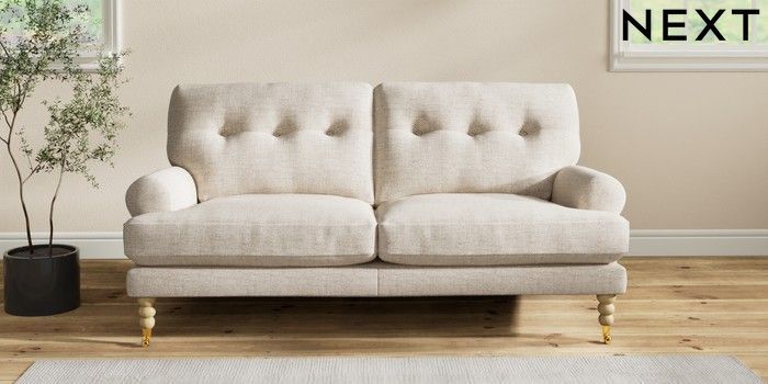 7.2.10 Erin Buttoned Back Deep Relaxed Sit 3 Seater Small Sofa Chunky Weave Mid Natural High Classic Turned Brass Castor - Light | Made Click here to use our website with more accessibility support, for example screen readers