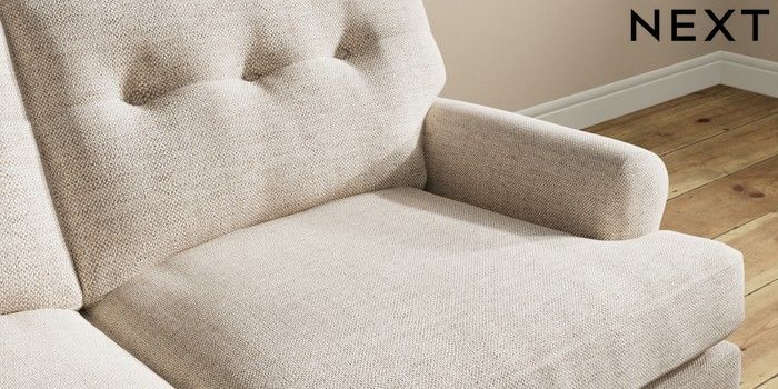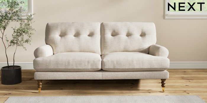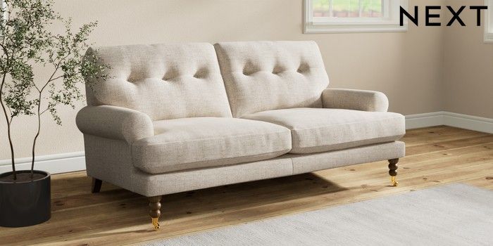 7.2.10 Erin Buttoned Back Deep Relaxed Sit 3 Seater Small Sofa Chunky Weave Mid Natural High Classic Turned Brass Castor - Mid | Made Click here to use our website with more accessibility support, for example screen readers