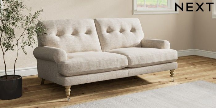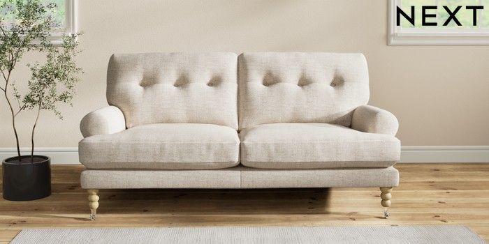 7.2.10 Erin Buttoned Back Deep Relaxed Sit 3 Seater Small Sofa Chunky Weave Mid Natural High Classic Turned Chrome Castor - Light | Made Click here to use our website with more accessibility support, for example screen readers