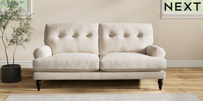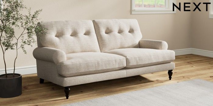 7.2.10 Erin Buttoned Back Deep Relaxed Sit 3 Seater Small Sofa Chunky Weave Mid Natural High Classic Turned - Dark | Made Click here to use our website with more accessibility support, for example screen readers