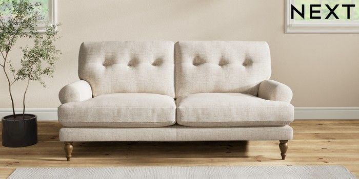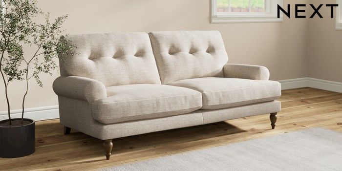 7.2.10 Erin Buttoned Back Deep Relaxed Sit 3 Seater Small Sofa Chunky Weave Mid Natural High Classic Turned - Mid | Made Click here to use our website with more accessibility support, for example screen readers