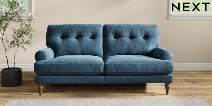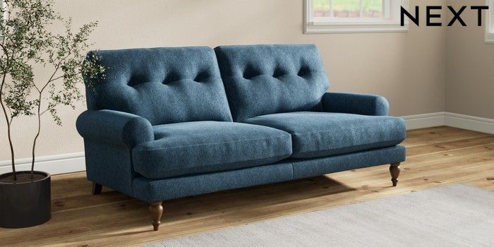 7.2.10 Erin Buttoned Back Deep Relaxed Sit 3 Seater Small Sofa Cotswold Chenille Dark Blue High Classic Turned - Mid | Made Click here to use our website with more accessibility support, for example screen readers