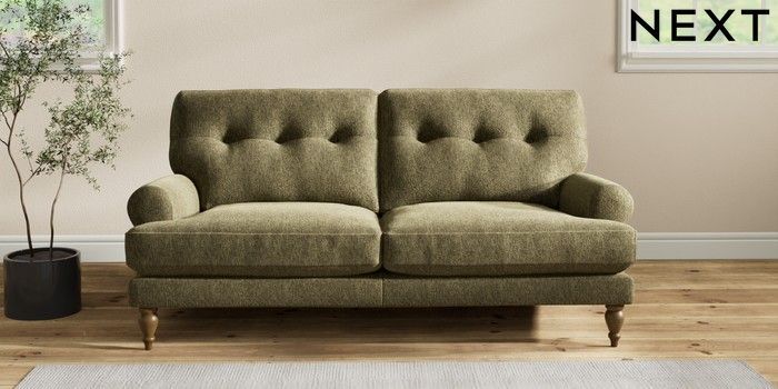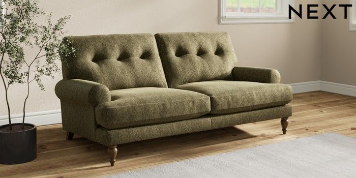 7.2.10 Erin Buttoned Back Deep Relaxed Sit 3 Seater Small Sofa Cotswold Chenille Dark Green High Classic Turned - Mid | Made Click here to use our website with more accessibility support, for example screen readers