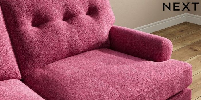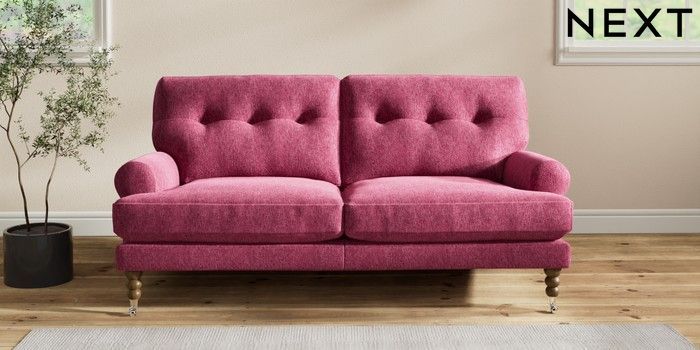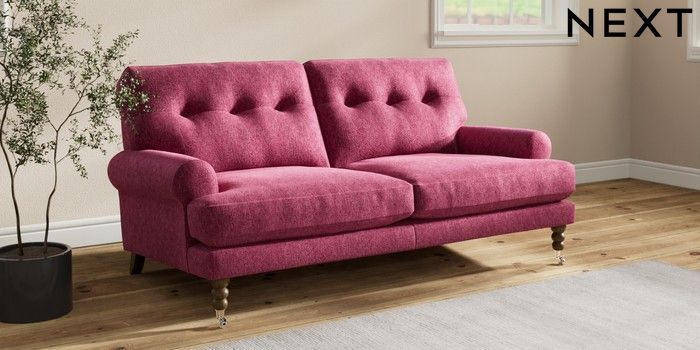 7.2.10 Erin Buttoned Back Deep Relaxed Sit 3 Seater Small Sofa Cotswold Chenille Dark Raspberry Pink High Classic Turned Chrome Castor - Mid | Made Click here to use our website with more accessibility support, for example screen readers