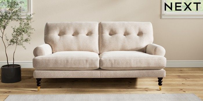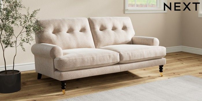7.2.10 Erin Buttoned Back Deep Relaxed Sit 3 Seater Small Sofa Cotswold Chenille Light Natural High Classic Turned Brass Castor - Dark | Made Click here to use our website with more accessibility support, for example screen readers